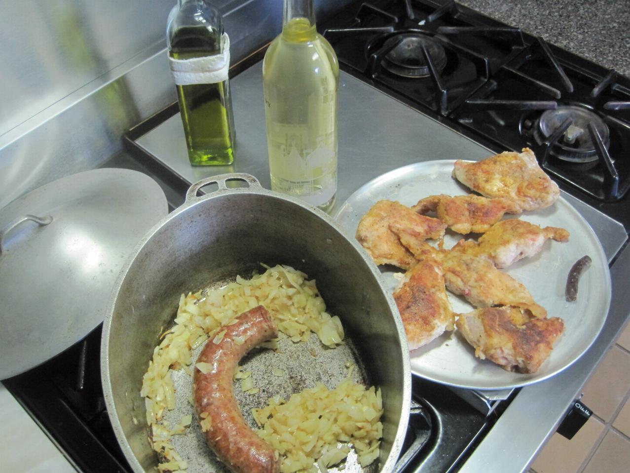 Cut up, whole rabbit in the freezer, cleaned, flour dusted, sautéed in olive oil looks like this. Add some Wilson’s pork sausage with onion, garlic, celery, for Creole authentication, and we’re in business.