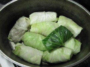 The process is simple if you have dexterious fingers. Blanch a whole cabbage so that the leaves can be pealed off without tearing. Season the lamb with garlic, salt, pepper, cinamon, some onion, and paprica.
