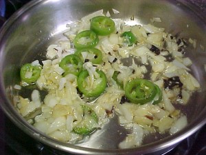 The whole thing begins with onions sauteing in a pan with olive oil. What’s new? I add some jalipino, then a taste of celery, 1 teaspoon toasted cumin seeds, and two toes diced fresh garlic.